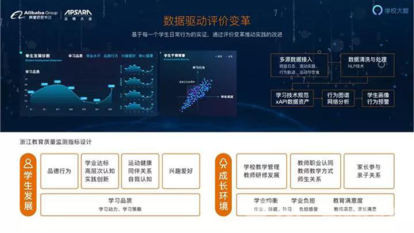 数据驱动评价变革。学校大脑力求通过多维的数据来全面了解一个学生,把班级日志、活动实践、行为轨迹、运动健康等多源数据接入,通过NLP等技术进行数据清洗和处理,形成满足学习技术规范xAPI的数据资产。这些数据再被用来做行为图谱和网络分析,从而描绘出学生的画像,并进行相应的行为预警。