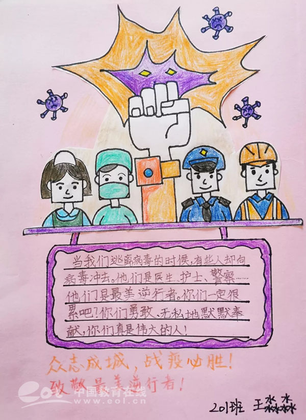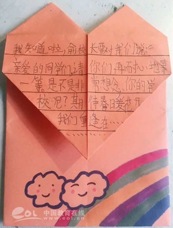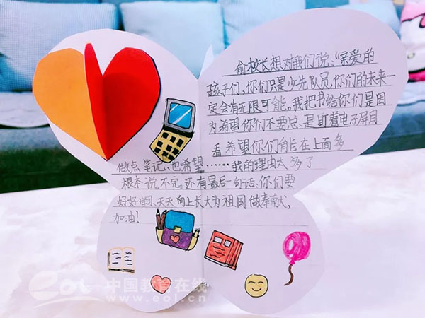 同学们运用这特殊的标点符号写成习作,记录假期生活;录制视频,向校长诉说宅家心情;制作感恩卡,抒发对抗击疫情坚守岗位、默默无闻做着贡献的平凡而伟大的人群的感激……