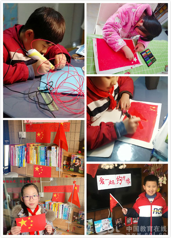 升旗仪式是一个庄严的仪式。在举行仪式前,每个同学都在家里打扫出一块专门的场地。国旗怎么办?同学们各有办法。有的同学拿出了国庆七十周年时的国旗;有的同学将国旗图片投放在电视和电脑屏幕上;有的同学拿起画笔,手绘出一幅国旗图案。同学们还下载了国歌,准备在升旗仪式上播放。这也是很多同学设备里的第一首国歌。