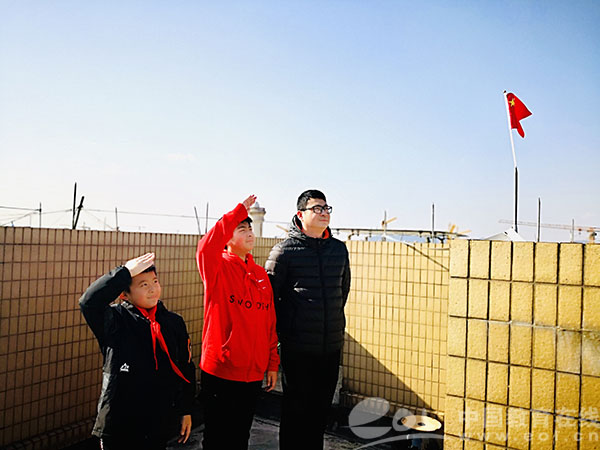 8点15分,升旗仪式正式开始。澎博小学的同学们在家穿着正式的服装,戴好红领巾,在庄严的国歌声中,向国旗敬礼。