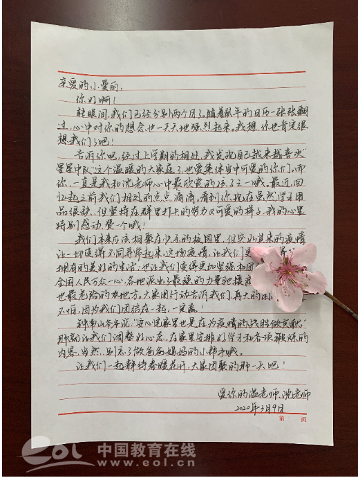 周新杰老师给学生昊宇写到:二月,我们班举行“云聚餐”的时候,你制作了水蒸蛋,为我们讲解制作过程。这个视频,我看了好几次,看到你一切如常,这种感觉真好!原来,“不变”就是最大的幸福。汪怡婷老师在信中说,学校里春意盎然,到处都是勃勃生机。桃花静悄悄地开放,草地里、树梢上都冒出了绿绿的嫩芽。教室里静静的,没有往日的喧闹,它在静静等待他的小主人们归来呢!