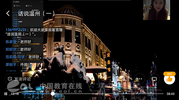 中国教育在线浙江站讯(记者 赵小倩 通讯员 齐倩凌)4月24日晚8时,来自意大利、西班牙、法国、意大利、日本等国的百余名华裔温籍孩子们,端坐在电脑前,在周莉苏、郭艳艳、姜伟、包昭昭四位特殊导游——温州大学海外华裔青少年云端华校华文班老师的带领下,开启了一趟与众不同的旅程——云游故乡温州。