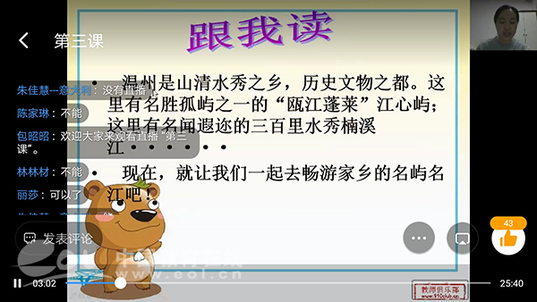 这故乡的味道,第一香,是风景。伴随着温州话版 “温州欢迎你”动听的歌声,美丽温州的画面缓缓呈现在孩子们的面前。通过云端网课的方式,孩子们好像在经历一场奇幻旅行,感受到了楠溪江、雁荡山大气豪迈,也体会到了南麂岛的小巧精致。网络,让孩子们即使身处异国他乡,也能将温州的青山绿水、大街小巷尽收眼底。