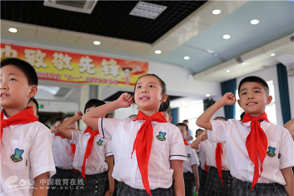 队旗招展,领巾飘扬,欢乐的节日里,一年级学生光荣入队,从此有了一个崭新而又骄傲的身份:我是中国少年先锋队队员!他们在队旗下庄严宣誓——时刻准备着!从小学先锋,长大做先锋。