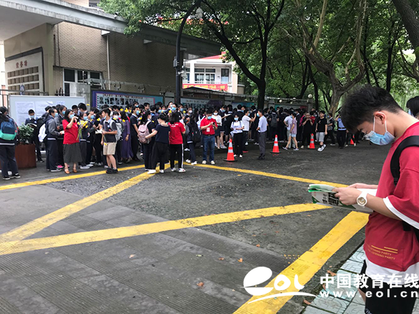 7.05分,风帆中学考场外学生准备进场,每个考生都戴着口罩,做好防护措施。