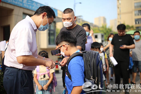 “小水滴”们在家长的带领下,在上学路上佩戴口罩,排队进校,有序进行晨检。他们先刷市民卡,再进行测温,陪同家长出示绿码并测温,每一步都一丝不苟。