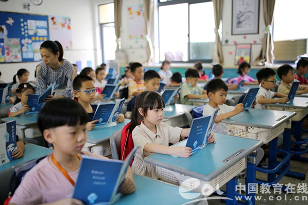 拿起书本,挺直身板,孩子们学着老师的样子,声音响亮的朗读手册上的那些好习惯童谣。