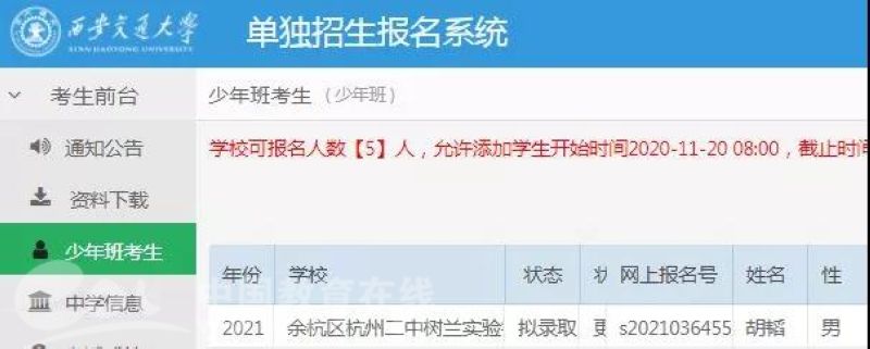 中国教育在线浙江站讯(实习记者 鲁少辛)在2021年西安交通大学少年班全国招生考试中,余杭树兰初中部903班学生胡韬,以数学第一、总分第四的优异成绩,被西安交通大学少年班拟录取!