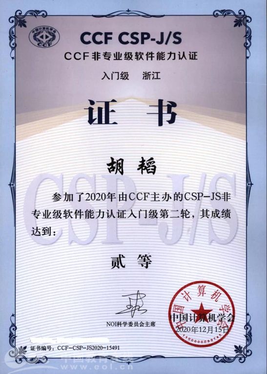 初中期间,胡韬同学在学校老师的指导下,学习了信奥相关课程:C++语言,(基础/树与图/图论)算法,高级数据结构线段树与SPLAY,学习各种动态规划,以及计算几何基础,并参赛获提高级二等奖。在2019/2020年由CCF主办的 CSP-JS非专业级软件能力认证入门级/浙江/第二轮竞赛中成绩达到二等;在2020年由CCF主办的 CSP-JS非专业级软件能力认证提高级/浙江/第二轮竞赛中,成绩达到二等。