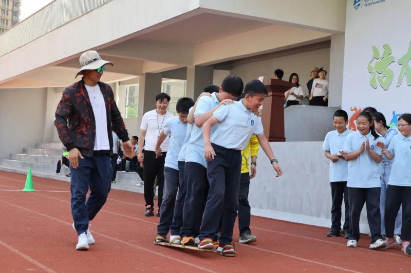 首届校运会本着让全体师生人人参与的目的,设置了两个师生共同参与的趣味项目和一个老师趣味项目。在紧刺激张的4*100接力赛后,趣味运动会掀起本场运动会新高潮。“四人同足”——四位同学左脚和右脚固定在两根木板上,四人必须保持同一频率,共同进退。每班四组共8男6女2老师,各班精心分组、合理安排顺序,以最快速度完成比赛。加油声、欢呼声、掌声,以及偶尔因失误导致摔倒时的尖叫声、叹息声让比赛氛围很是紧张,很好地体现出班级的团队精神。