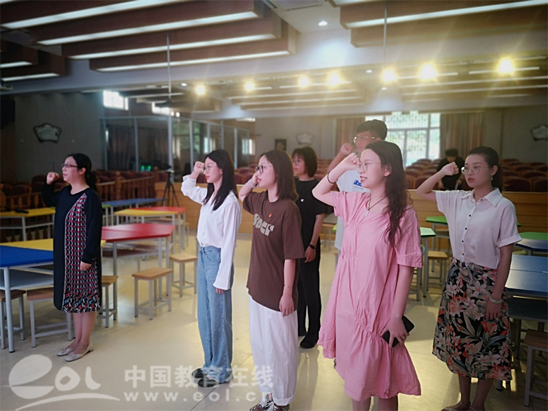 随着教师队伍的日益壮大,很多年轻教师走进青华这个温暖的大家庭。为此,学校工会特地组织全体新教师在教师节这天,在国旗下,重温教育誓词。吕晓丽校长带领新教师进行了入职宣誓,6位教师以年轻、蓬勃、充满朝气的姿态,满怀着对孩子、对教育事业的一腔热爱,用坚定的信念一字一句的宣誓。作为人民教师的无限自豪在每位新老师心中激荡,立德树人的责任与使命越发厚重神圣。