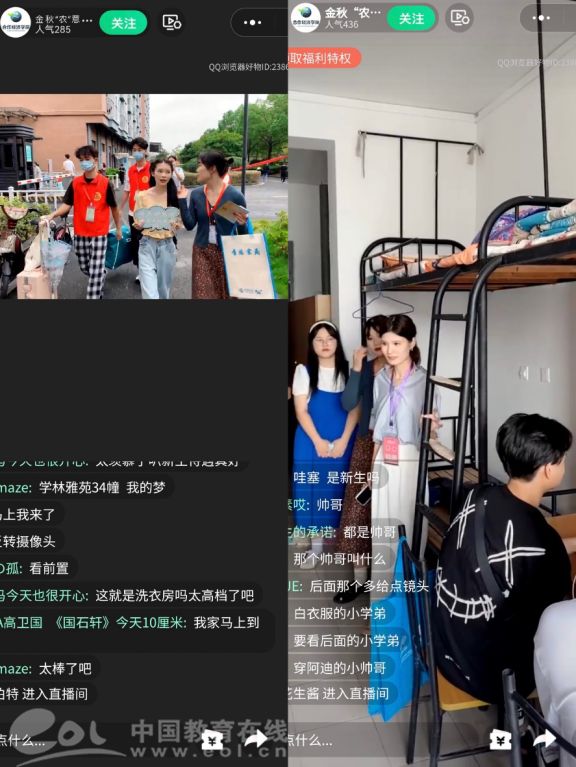 中国教育在线浙江站讯 (记者 张可宁 通讯员 谢逸)“欢迎各位家长云逛我们的新生寝室楼,卫生间干湿分离,还配备空调、洗衣机、烘干机......” 9月16日9:00,浙经贸合作经济学院的师生开启了一场“金秋‘农’意 ‘合’你同行”带新生家长云逛校园直播活动。因为疫情防控要求,家长无法亲自将孩子送入校园。新生进入学校后,有些家长一直在接待区停留,内心非常不舍、不安。为了让家长放心、舒心、暖心、安心,合作经济学院启动了这场直播。