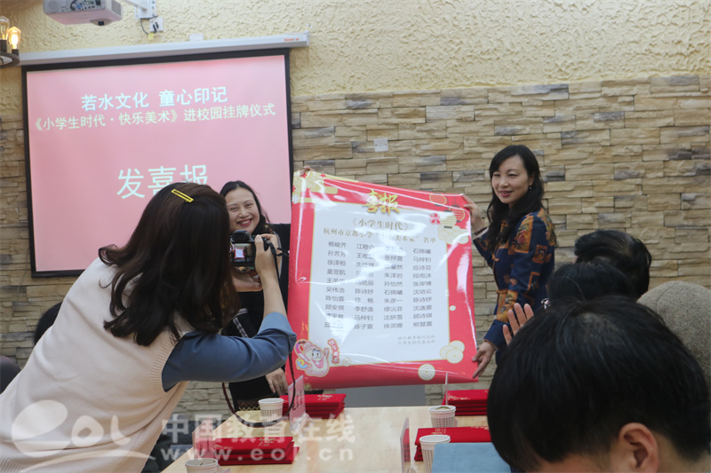 赵宗藻老师、林琼老师给学校授牌,颁发喜报;专家们给“小小美术家”颁奖。