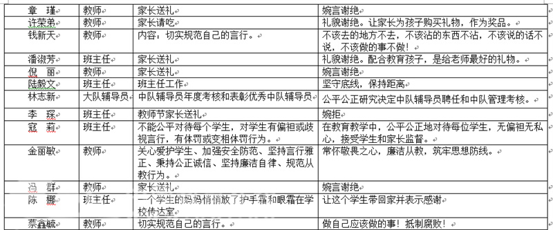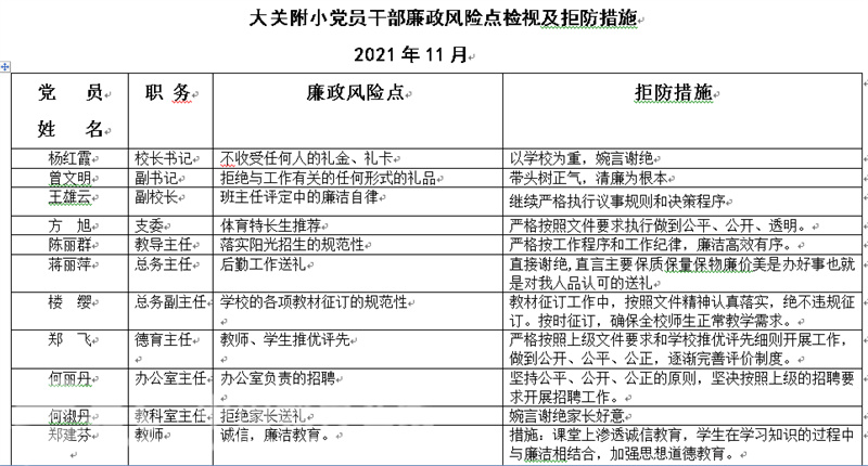 学校的党员教师,大多在领导及各项管理岗位,都存在着“一岗双责”的职责。在日常的工作中,必须做到一手抓业务,一手抓廉政,防微杜渐;必须对自己分管的工作可能存在的廉政风险做到心中有数,警钟长鸣。这次廉政教育活动中,全体党员干部结合自己分管的工作及教育教学管理岗位,认真检视了廉政风险点,并提出了切实可行的拒防措施。