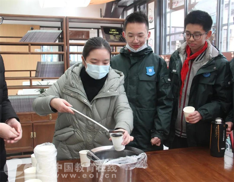 午餐时,同学们已经喝上了各种热汤:羊杂、红枣、青蒜、胡椒,各种食材阴阳相济,中正平和,温暖人的肚腹,熨帖人的心灵。羊汤讲究一个食药同源,萝卜丸子汤则用简单的食材,勾起同学们童年的记忆;江南名点酒酿圆子,甜蜜温煦,好吃不腻;国旗色的西红柿鸡蛋汤、可乐姜丝炮制的特制姜汤等都很“落胃”,助饭、佐餐、溜缝,汤被不同的师生赋予不同的意义,“暖”却是它们共同的底色。