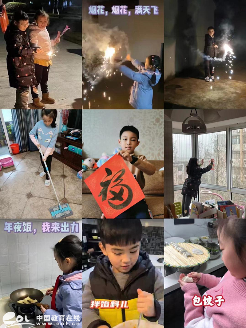 中国教育在线浙江站讯(记者 张可宁 通讯员 杨洋)春节,一年之岁首,百节之首,上古时代起,便有了立春之日祭祀祖先、拜谢神灵的文化活动,流传至今,人们仍以除旧布新、迎喜接福、祈年祭祀为主要内容来迎接新年的到来。今年的春节是国家实施双减政策的第一个寒假,在这个欢乐的节日里,我们一起来看看杭州市行知小学三(5)中队的孩子们在干什么吧!