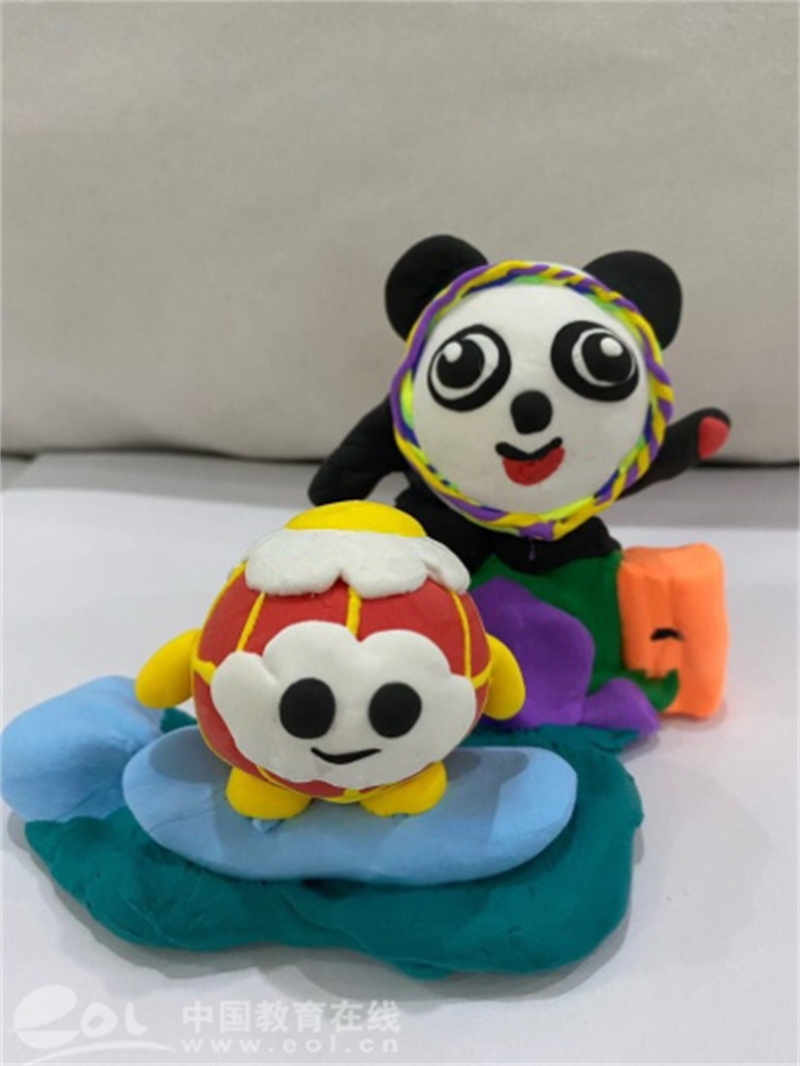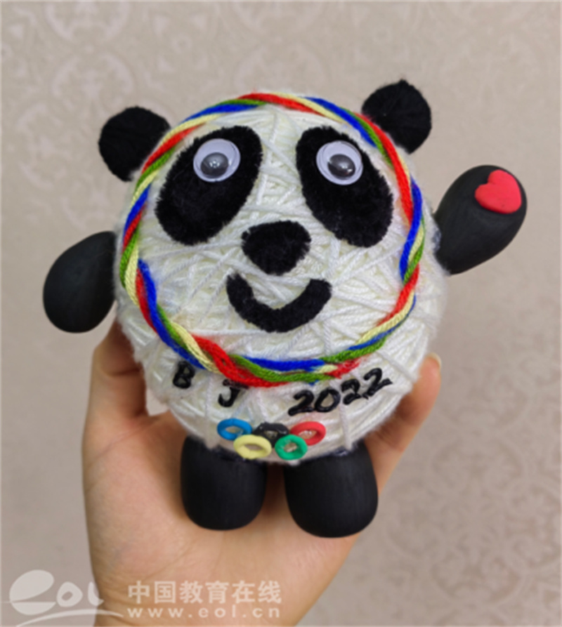 孩子们利用自己的特长,用自己的双手制作出了憨态可掬、精妙绝伦的各式“冰墩墩”。有的运用绘画形式画了一个冰墩墩,有的选择用黏土塑造了一只只“冰墩墩”,还有的选择用毛线织成一个冰墩墩。