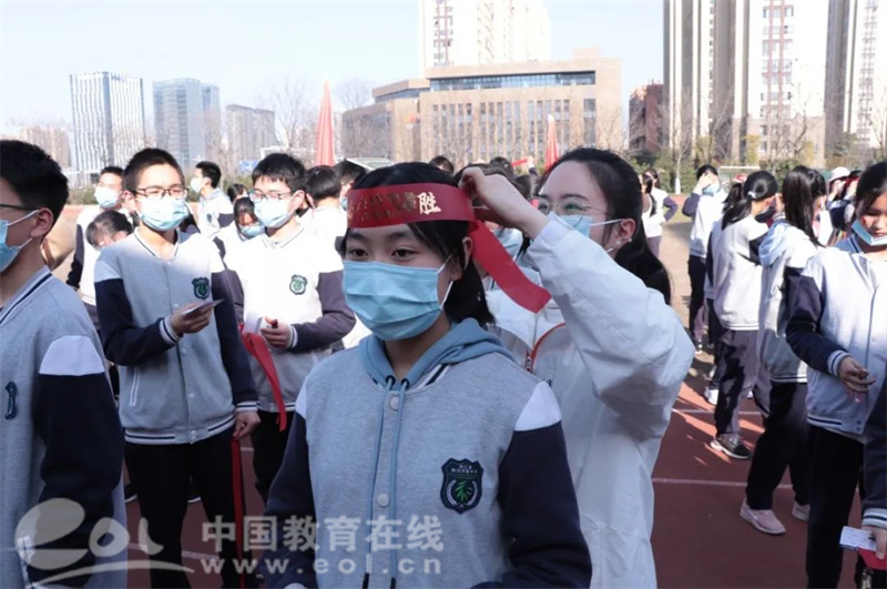 随后,周国霞副校长为各班颁发了必胜旗,任课教师们则为同学们扎上必胜发带。