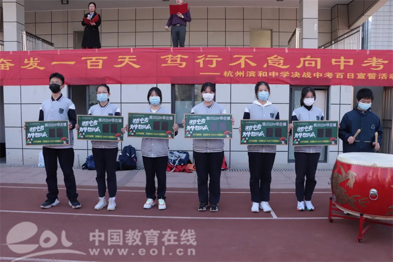 中国教育在线浙江站讯 (实习记者 鲁少辛)3月11日下午,滨和中学全体初三师生齐聚操场,举行主题为“踔厉奋发一百天,笃行不怠向中考”百日冲刺誓师大会。