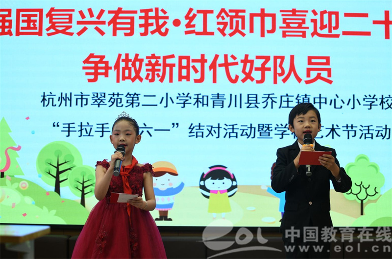中国教育在线浙江站讯 (实习记者 占尘雪 通讯员 须雅洁)今年是党的二十大召开之年,5月31日,为庆祝六一国际儿童节,杭州市翠苑第二小学为本校及青川县乔庄镇中心小学校全体少先队员们准备了一份有温度、有厚度的节日礼物——“红领巾喜迎二十大 争做新时代好队员”活动。