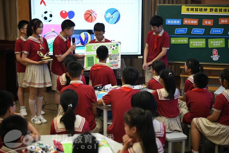 须雅洁老师和六(2)中队的队员们合作展示了六年级“健体章”争章实践课。实践课由“习爷爷教导记心间”、“红领巾一齐看奥运”、“快乐健身运动我参与”三个大活动串联而成。队员们在在活动中了解奥运精神、奥运故事,畅谈球类规则,感受运动的快乐。实践活动后,队员们畅谈感受,对强身健体,为中华民族的伟大复兴而努力有了更深的理解!