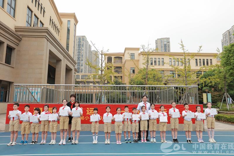 现场还启动了学校的“亚运体育嘉年华——暨校园吉尼斯达人挑战赛”活动,火炬从邵依雯手上传递给学校党支部书记、少工委主任周晓婷,团员教师代表何倩倩和最后的少先队员代表陈瀚远。