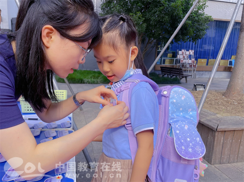 前方的路上,一年级班主任们面含笑意,亲手将准备好的姓名牌,挂在孩子们的校服上,沐浴在阳光下,像花儿一样。