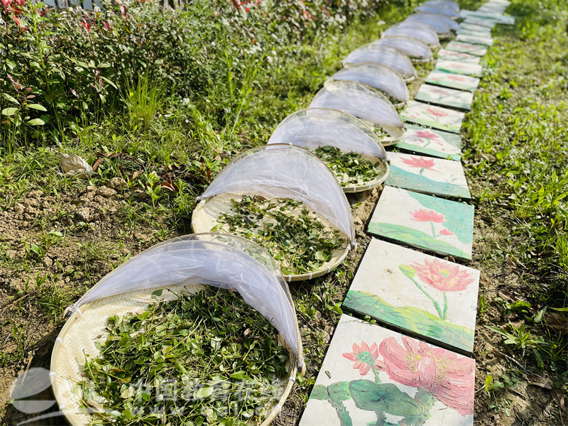 短短十几分钟,大家采摘的叶子已能铺满竹匾,接下来要把叶子用清水清洗干净,揉一揉,摸一摸,清洗过后重新捞回竹匾进行晾晒。