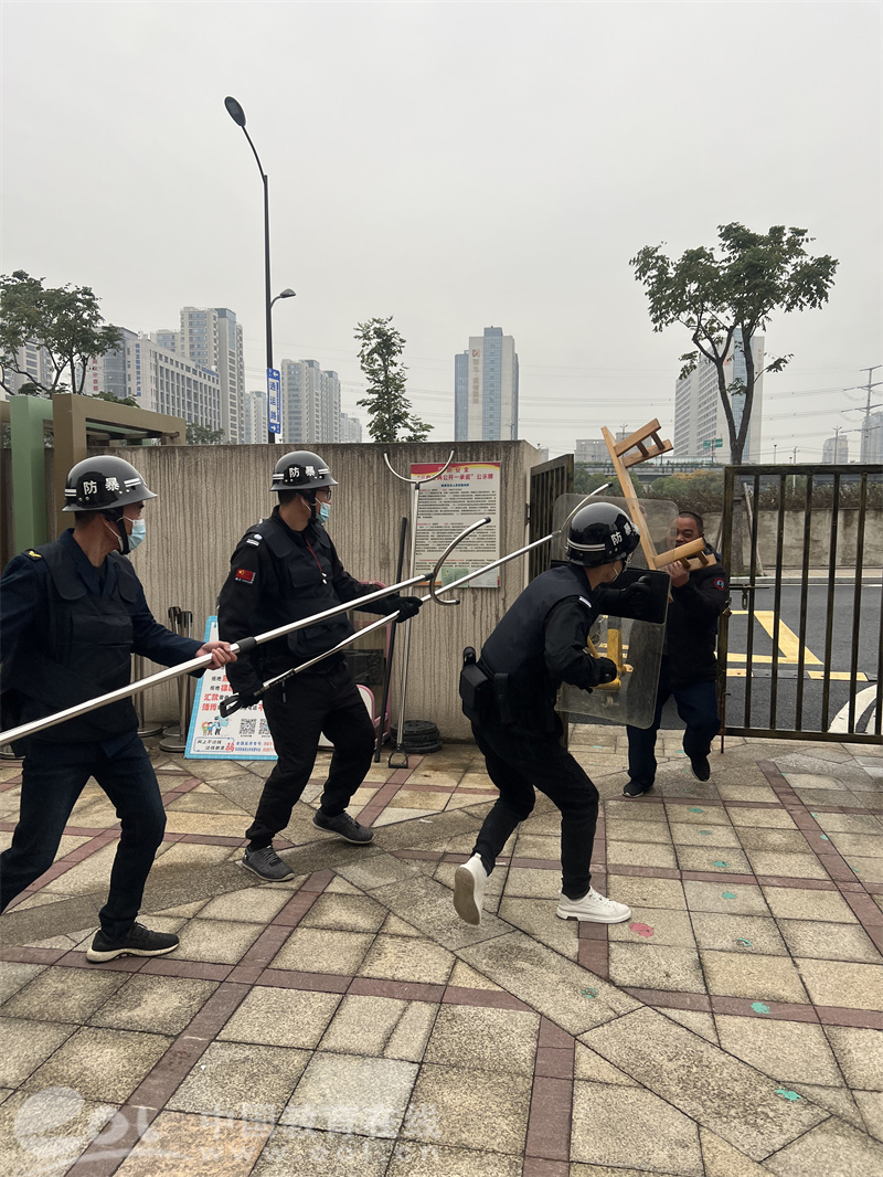 在实战演练环节,良渚新城派出所王教官扮演“歹徒”冲进幼儿园,应急小分队与保安师傅迅速做出反应,大家相互配合,两名成员使用防护盾将“歹徒”挡住,其余成员在身后配合,用钢叉、长棍等将“歹徒”推至角落,合力将其制服。