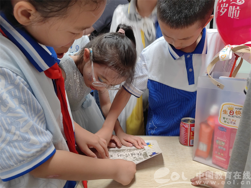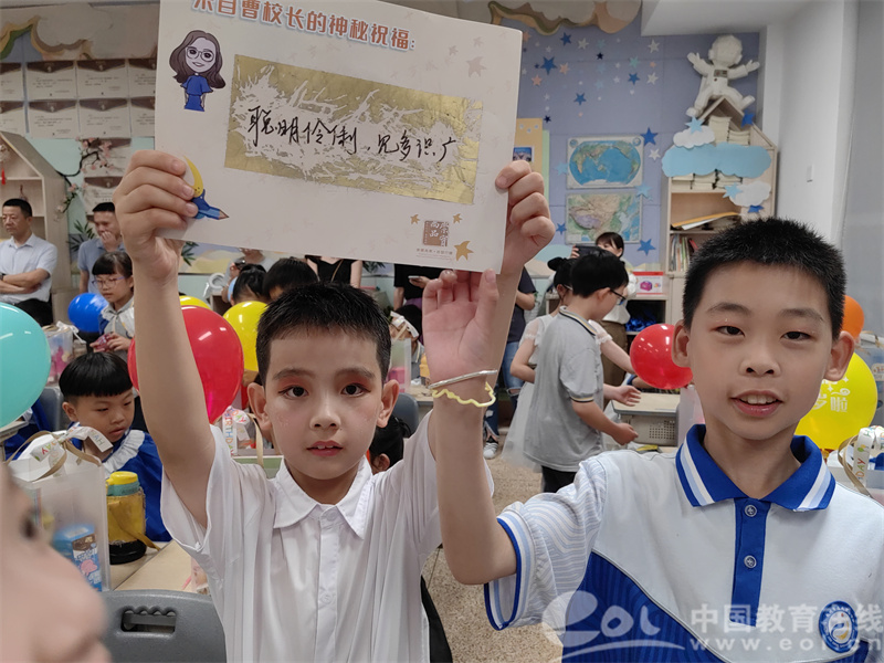 学校送给三年级同学们的祝福藏在神秘的刮刮卡里,每个小组通过齐心协力的“呱呱”行动下看到了每一句由校长亲手写下的祝福语——“海阔凭鱼跃,天高任鸟飞”“学而不倦,前途无量”……孩子们收到来自校长心意满满的祝福语,激动得欢呼雀跃。