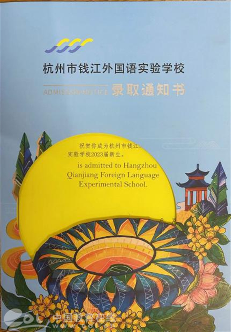 记者拿到这份录取通知书发现,颜色明亮、图案现代、风格大气。其设计理念融合了传统文化与现代艺术,封面以亚运会场馆和杭州市花桂花为主要元素,结合凸印、烫银、镂空等多种工艺;中间镂空,巧妙展示“三潭映月”的美丽风景;底部是钱外的特色建筑,寓意2023级新生“胸怀祖国,行走天下”。