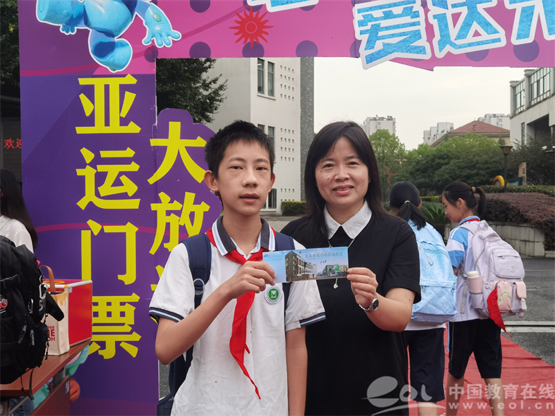 “好运等着你”“大奖等你来抽”......上午7点,丁兰实验中学的校门口响起老师的吆喝声,四个大大的印有亚运吉祥物的红色抽奖盒格外醒目。前来报到的同学们将手伸进抽奖盒,抽出惊喜门票,表情便从疑惑转变为惊喜。