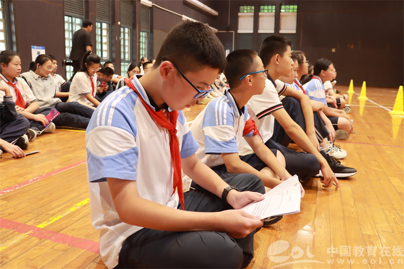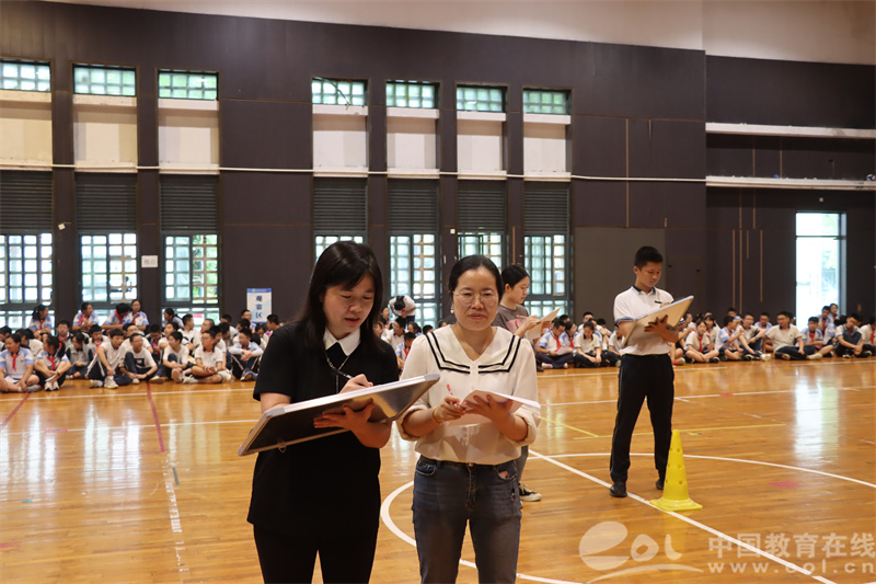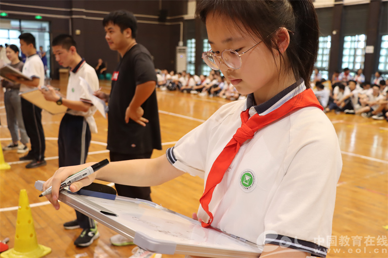 经过初赛后,共有50名同学晋级半决赛。在学校天健馆,晋级的同学抽取小组序号,大家以10人为一组进行亚运知识接力竞赛,获胜的小组便可与校长进行同台竞技。本轮比赛共有10道亚运知识相关的题目,每位同学答完1道题之后,需完成20米折返跑接力,将答题交给下一位同学进行答题。答题正确率最高,且用时最短的小组获胜。这是一场集智力、体力为一体的综合素养比拼。