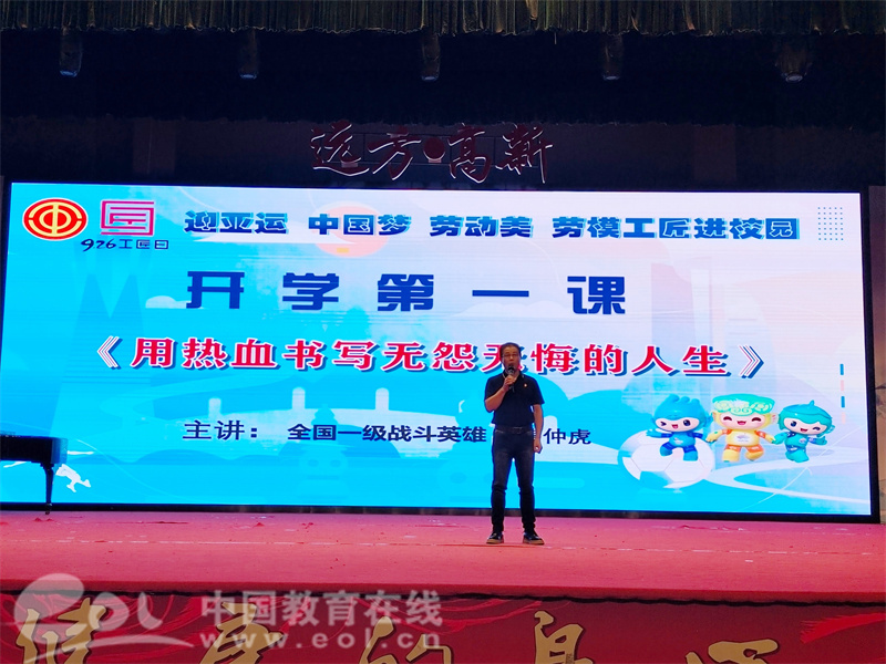七年级的开学典礼邀请了国家一级战斗英雄、全国劳动模范黄仲虎作为“劳模工匠进校园”来校宣讲英雄故事。他给师生们讲述了对越自卫反击战中的革命先辈的英雄事迹,向同学们传递了爱国主义和英雄精神的重要价值。