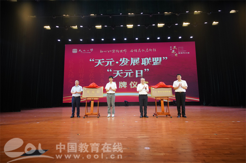 天元公学的发展离不开敢于创新、大胆思考、勇于探索的天元人。自2020年创校以来,天元公学坚持“通才与专才并育”的育人理念,充分彰显“学术与艺术相长”的办学特色,以“基础扎实,特长凸显,专长突出”为教学总目标,携手杭州二中、杭州市文澜中学、杭州二中白马湖学校、杭州市人民政府机关幼儿园,结成战略合作伙伴关系,培养了数十名清北复交浙等高校的优秀学子。此次庆典举行了“入校三年教师团队授牌”仪式,并对为天元发展做出突出贡献的优秀教师、学生、家长等进行表彰,感谢和肯定他们的突出贡献。