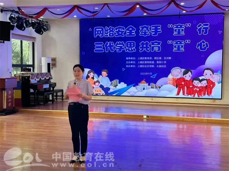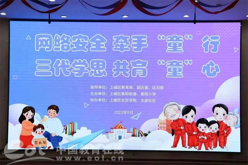 中国教育在线浙江站讯(记者 陈显婷 通讯员 施可心)为了普及网络安全知识,营造清朗、健康、文明的文化环境,进一步推进“家校政社”协同育人机制,深化“父母茶座”试点工作,在2023年网络安全宣传周来临之际,紫阳小学联合紫阳街道开展了“网络安全牵手童行,三代学思共育童心”主题活动。