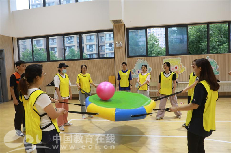 “战鼓呐喊”需要团队成员手眼协调、齐心协力,一旦出现高低不一的情况,战鼓上的彩球就会奔向远方。老师们通过总结经验、团结协作,让球在鼓面上欢快地蹦跳着。球的每一次跳动,都承载着集体的脉搏和心跳。