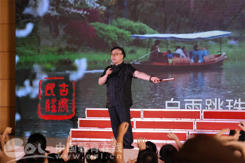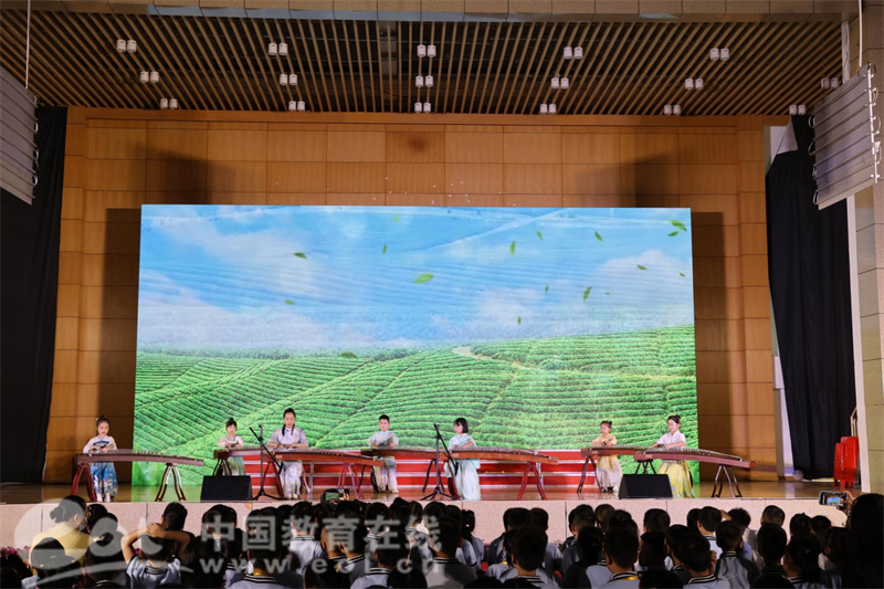 陈老师用一首《望湖楼醉书》,让文学与音乐发生碰撞,开启古诗词和民谣音乐的神奇之旅。“一袭弦音听蒹葭,曲高情浓满幽素”孩子们冉冉纤指,轻拨古筝,诉说着采茶之道,悦耳动听。
