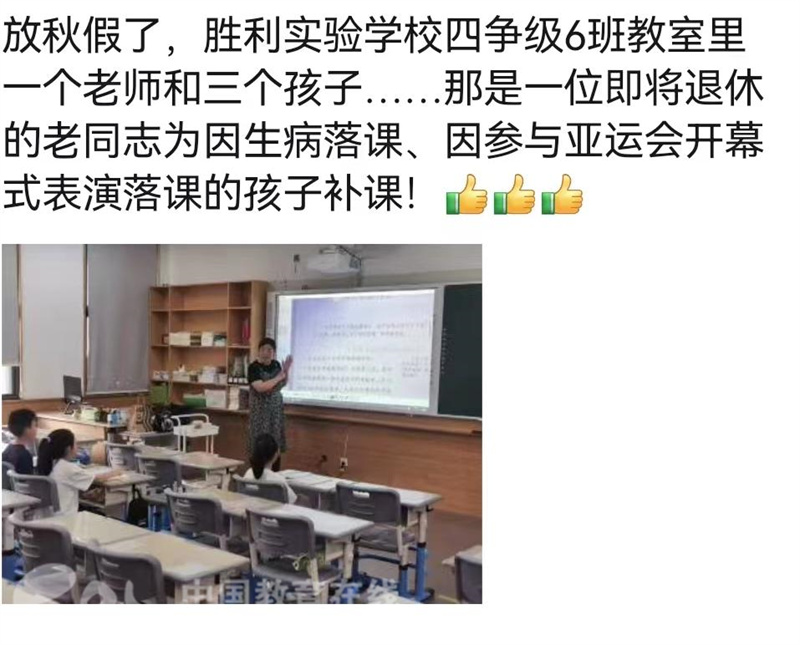 图片上是一位老师站在讲台上,面对着教室里仅有的三个学生。张校长配文:那是一位即将退休的老同志为因生病落课、因参与亚运会开幕式表演落课的孩子补课。