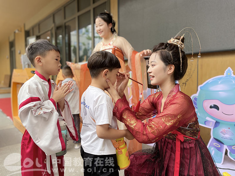 节日是让某一天与其他日子不同,使某一刻与其他时刻不同,幼儿园里张灯结彩,喜气洋洋,门口铺设了长长的红地毯,三位“嫦娥姐姐”早早在门口迎接大家,细细为每一个来园的孩子“点福”,带上福气入园,孩子们脸上的笑脸一个个比阳光还灿烂。