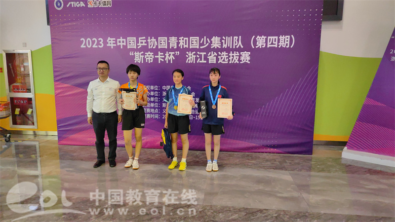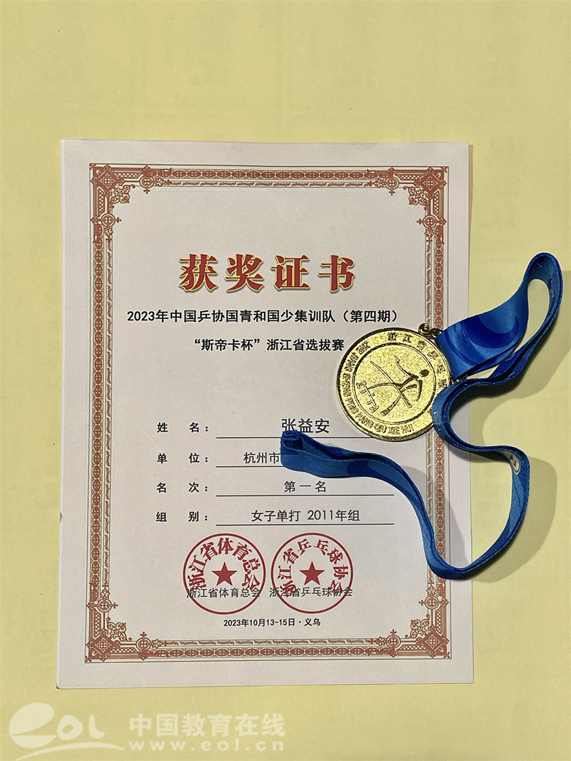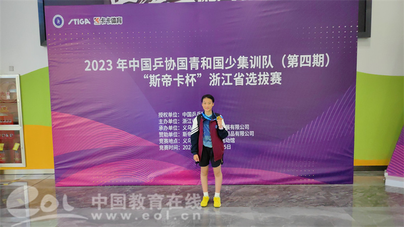中国教育在线浙江站讯 (记者 陈显婷 通讯员 徐燕军)风雨彩虹,铿锵玫瑰。近日,杭州市钱塘区的文海中学学生张益安勇夺2023 年中国乒协国青和国少集训队(第四期)“斯帝卡杯”浙江省选拔赛冠军。在成为“国字号”选手的道路上,又向前迈进了一步。