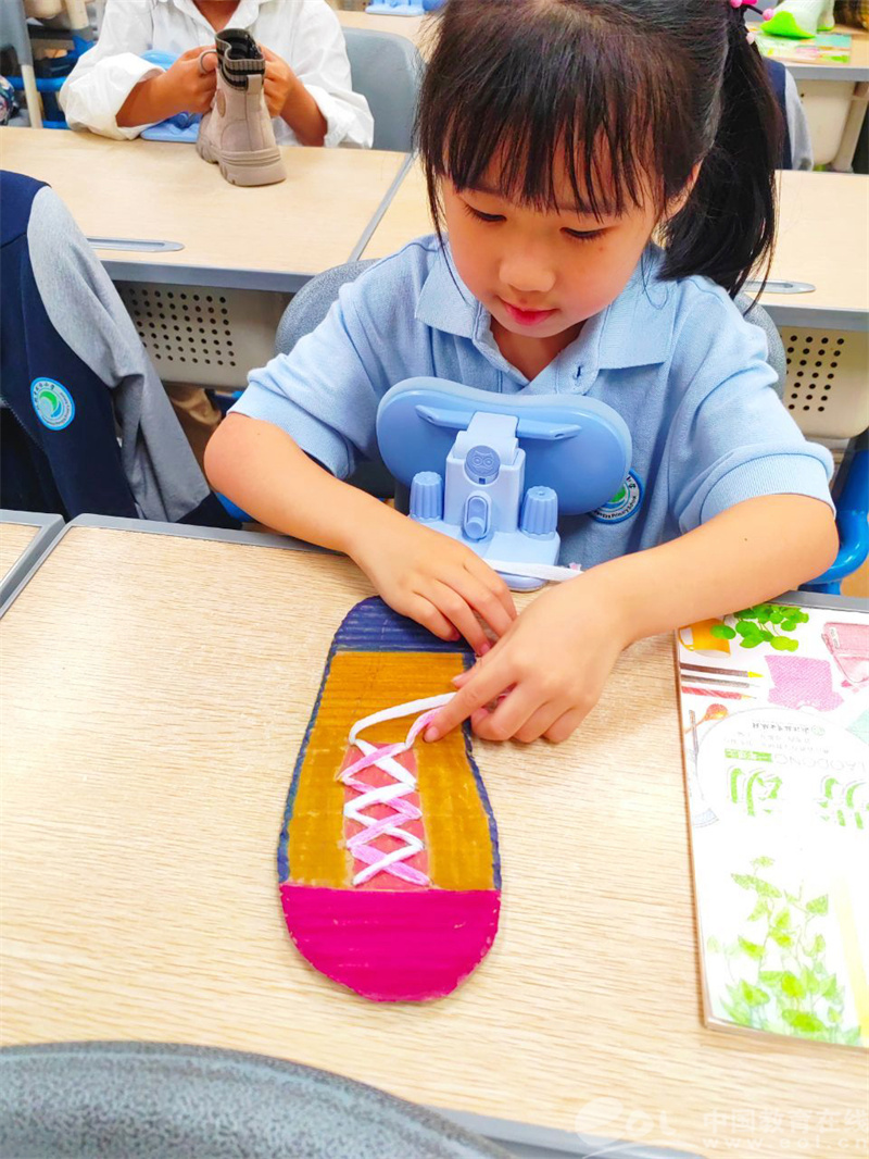 “冠必正,纽必结。袜与履,俱紧切。”系鞋带是生活必备技能,活动前,一年级的同学们就提前跟着老师的讲解演示,学习了穿鞋带,再打蝴蝶结。活动当日,同学们都自信满满。看见小伙伴动作不熟练,还能热心地上前帮忙,做起小老师,嘴巴里念叨着:“先这样,再这样”。
