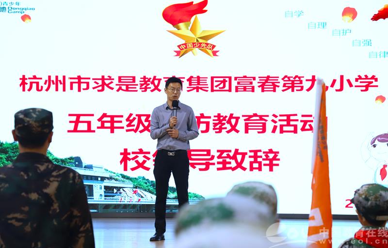 在开营仪式上,全体少先队员身着绿色军装,庄严肃穆。在教官的引领下,队员们对开营仪式表示出了极高的热情和认真的态度。求是富春九小党支部书记、校长孟旭东对全体营员进行了动员讲话,他鼓励同学们以严格的要求,高度的热情投入到本次国防教育中去。学生代表方梓桐代表全体营员表态,立志在此次国防教育活动中发扬不怕苦不怕累的精神,力争超越自我。