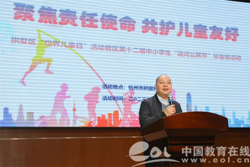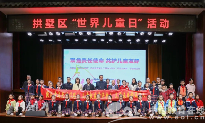 中国教育在线浙江站讯(通讯员 吴月婷)11月10日下午,杭州市拱宸桥小学的崇德堂里不时传来孩子们的惊呼与欢叫,“亚运火炬手”、“现场采访”等热词跳跃在他们的口中。由拱宸桥小学教育集团承办的“聚焦责任使命、共护儿童友好”世界儿童日暨拱墅区第十二届中小学生“运河公民节”分会场活动正在举行。