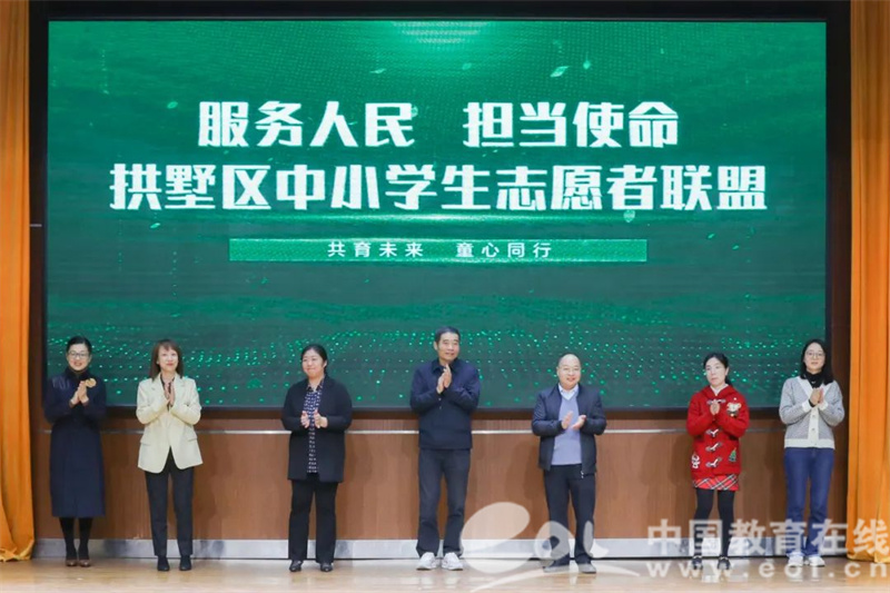 接下来各位领导、嘉宾一同登台发出倡议《“服务人民 担当使命”拱墅区中小学志愿者联盟》,秉承志愿服务精神,让有需要的人、身边的人感受到来自我们的温暖和美好。