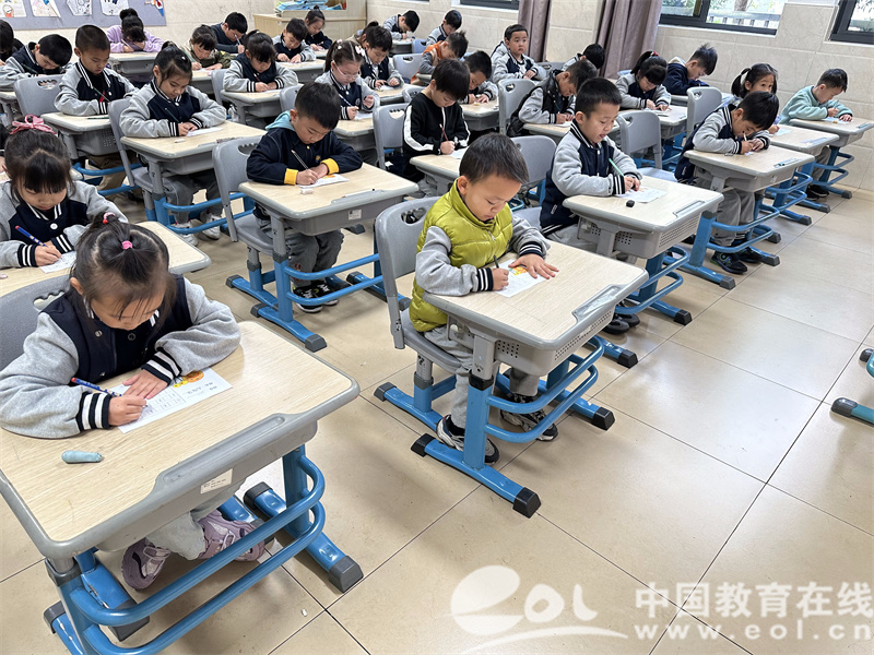 在汉字书写素养竞赛中,一二年级的学生们坐姿端正,认真书写平常所学过的生字。孩子们坐姿端正牢牢记住上课所学的“一尺一拳和一寸”。有的孩子写完了和老师的例字进行比较,争取写得更美观;有的孩子保证书写纸干净整洁,给评委老师留下好印象。