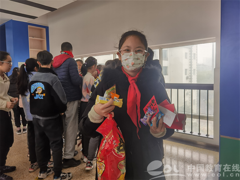 “我抽到了十块钱!”“我也抽到了,我还抽到了免作业券。”602班的王子骞和陈懿轩打开红包惊喜地叫了出来,“我回去就把钱存进存钱罐。”两个男生凭积分分别抽了5个和6个红包,每个他们都很喜欢。601班的顾懿凡抽中了一个零食大礼包,“没想到能抽到这样的大奖,太惊喜了,”她抱着礼品说,“我要和朋友们分享这个大奖”。