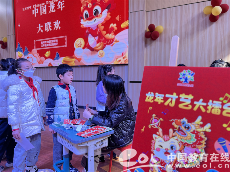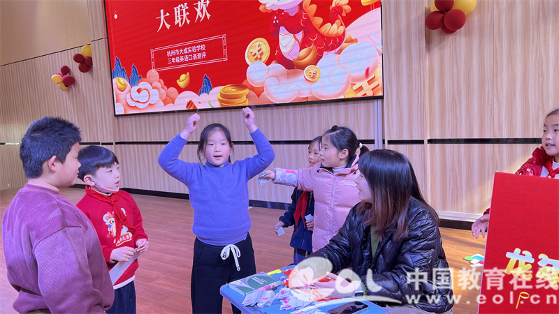 中国教育在线浙江站讯(通讯员 余晓鸣)近日,杭州市大成实验学校三年级的小朋友们参加了一场充满欢乐与挑战的英语口语测评活动,其精彩热闹程度堪比龙年的庙会!此次活动以游园会的形式进行,融合了唱歌、跳舞、游戏等多种元素,使考试过程趣味盎然。