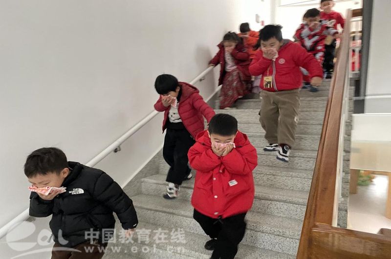 尽管演习没有任何预警,但在警报声响起的第一时间,全园幼儿在老师的带领下弯腰前行、手持湿毛巾并捂住口鼻有序撤退,于2分钟内在操场上集合完毕。