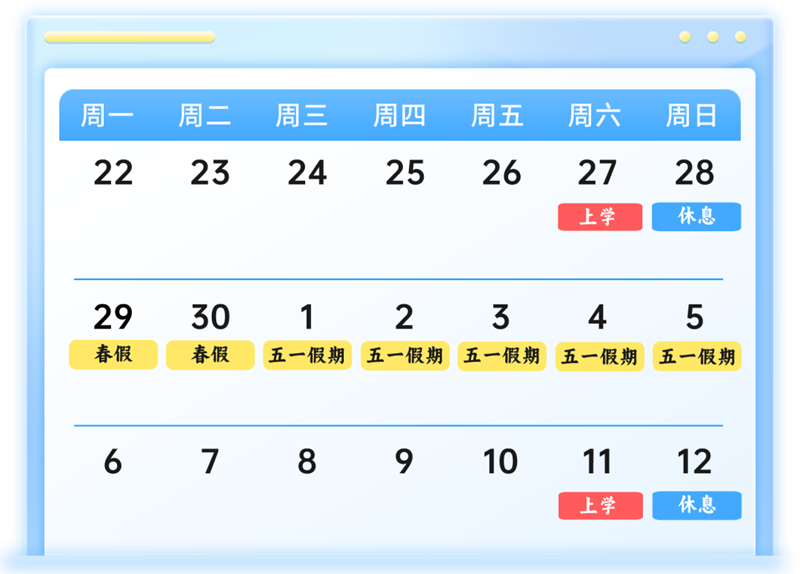 五一假期:5月1日-5日劳动节放假。根据国务院调休安排,5月11日上班。